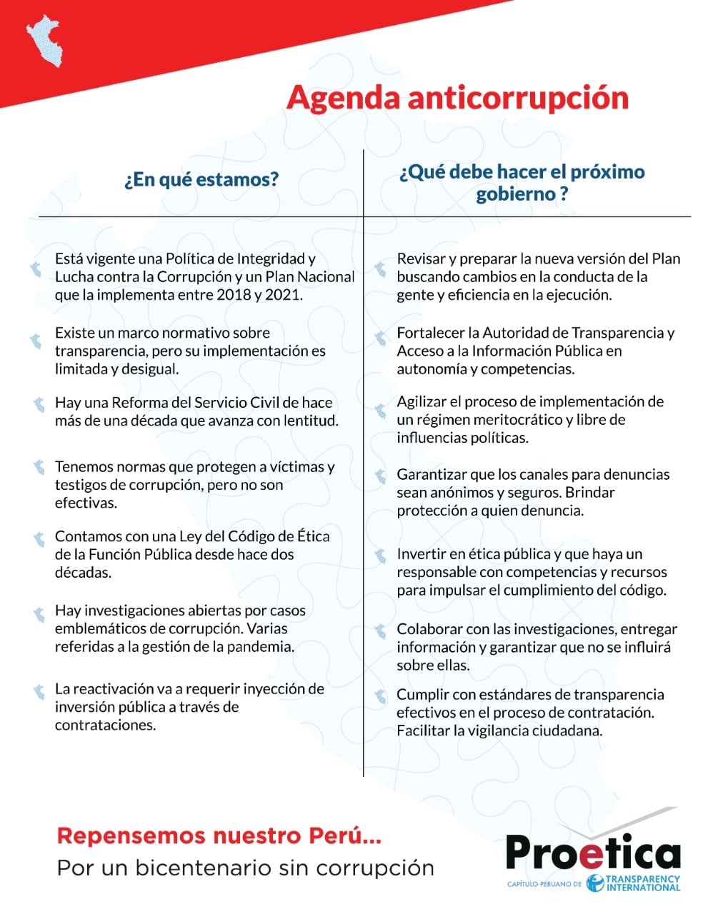 Samuel Rotta, director ejecutivo de Proética, capítulo peruano de Transparency International indicó que entre las preguntas realizadas a los candidatos están las relacionadas a la prevención de la corrupción porque es algo que no se suele tocar, aspectos específicos como por ejemplo el transparentar los contratos que están fuera de la ley de contrataciones del estado.