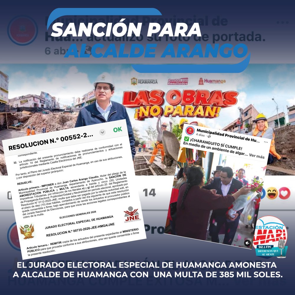 Dos resoluciones del Jurado Electoral Especial (JEE) de Huamanga dispusieron sanciones económicas contra el alcalde provincial de Huamanga, Juan Carlos Arango, por infringir el Reglamento de Propaganda Electoral, Publicidad Estatal y Neutralidad durante el periodo electoral.