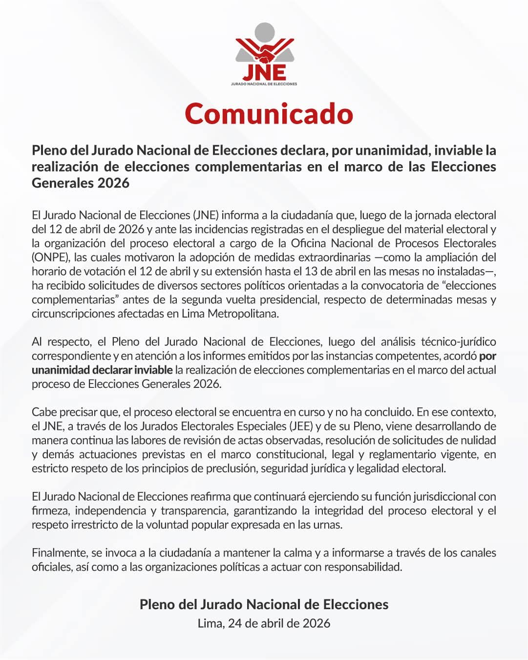 El pleno del Jurado Nacional de Elecciones (JNE) declaró inviable la realización de elecciones complementarias tras los comicios generales desarrollados el 12 y 13 de abril de 2026.